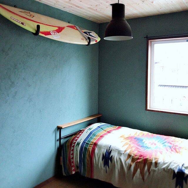 壁紙屋本舗 グレイッシュなブルーの壁紙を使ったスタイリング お部屋全体のトーンを落ち着かせることでサーフボードの鮮やかなイエローが映えます スタンダードな星やストライプなら 柄 柄のコーディネートにも挑戦しやすいですね 壁紙屋本舗 壁紙屋本舗でおうち